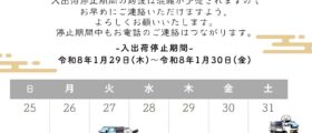 お知らせ TOP > お知らせ NEWS お知らせ 2026.01.13 【棚卸に伴う入出荷停止のお知らせ】 2025.11.12 お知らせ 【2025年・2026年】年末年始休業のお知らせ 2025.04.27 お知らせ ゴールデンウイーク営業日のお知らせ 2025.01.23 お知らせ 関東営業所電話・FAX不通について 2024.12.16 お知らせ 年末年始休業のお知らせ 2024.12.12 お知らせ 関東営業所電話・FAX復旧について 2024.12.12 お知らせ 関東営業所電話・FAX不通について 2024.09.25 関西営業所 交通規制に伴う入出庫時間変更のお知らせ 2024.08.06 お知らせ 夏季休業のお知らせ 123…5