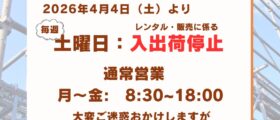 お知らせ TOP > お知らせ NEWS お知らせ 2026.03.31 埼玉機材センター 土曜日入出荷停止のお知らせ 2026.03.03 愛知機材センター 土曜日営業休止のお知らせ 2026.01.13 【棚卸に伴う入出荷停止のお知らせ】 2025.11.12 お知らせ 【2025年・2026年】年末年始休業のお知らせ 2025.04.27 お知らせ ゴールデンウイーク営業日のお知らせ 2025.01.23 お知らせ 関東営業所電話・FAX不通について 2024.12.16 お知らせ 年末年始休業のお知らせ 2024.12.12 お知らせ 関東営業所電話・FAX復旧について 2024.12.12 お知らせ 関東営業所電話・FAX不通について 123…5