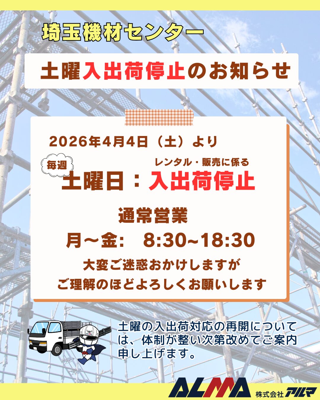 埼玉機材センター 土曜入出荷停止のお知らせ